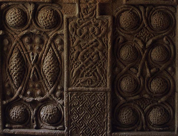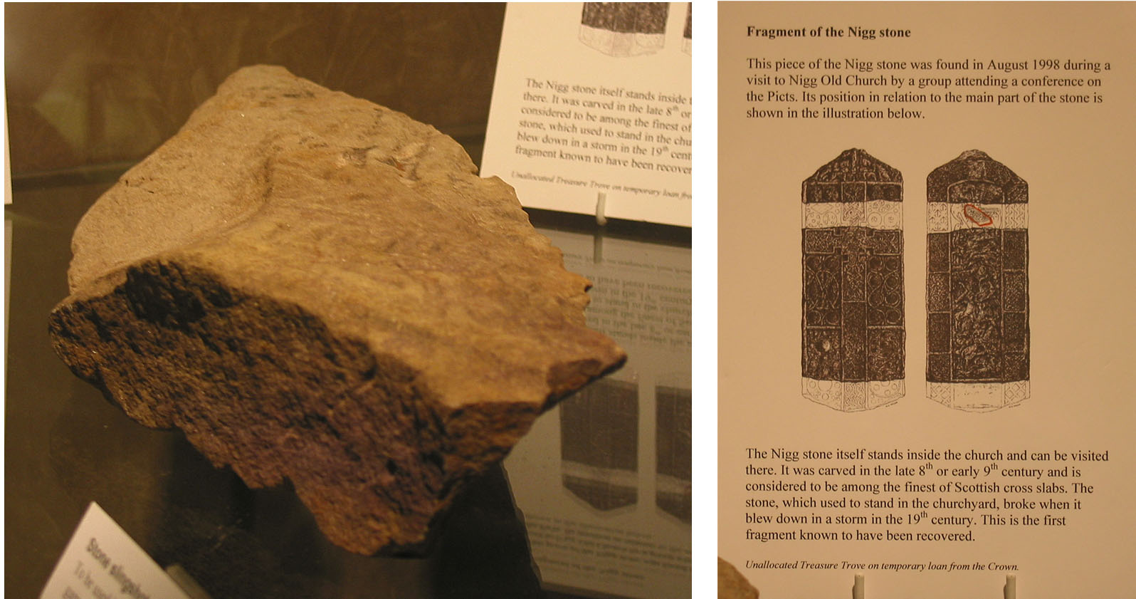 | Niggの教会内に保存されているこの石碑はピクトの石碑で最も見事なものの一つだ。組み紐の球など、ボリュームがあり、ほとんど半立体で、編み目の質感もすばらしい。十字架はアングロ・サクソン的な組み紐文様で埋められており、上部には聖パウロとアントニウスの像がある。裏面はピクトのシンボルと狩りのシーンなどだが、削られており、鮮明でない。上部は一部失われており、「ゾウ」のシンボルがあったのだが、ちょうどその部分が欠けている。が、近年、ごく一部が発見され、Tainの博物館に保存されている(下の中央の写真)。ワシのシンボルが見える。 |