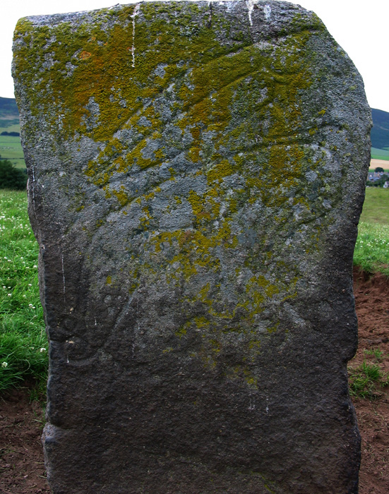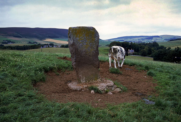 | Rhynie市街からやや南に下ったCraw Staneの農場の見晴らしのいい小高い丘の上に立っている。オリジナルの場所に残っている数少ない石の一つらしい。車道から見えにくい位置にあり、見学も解放されていない。が、ちょっと柵を越えて牛のフンだらけの牧草地を少しだけ歩けばいい。本来は許可が必要と思われるが。Rhynieには市街、町はずれの教会に他にもいくつか石碑があり、現在AberdeenのWood Hill Houseにある斧を持ったピクト人像もここで発見された。シャケと「ゾウ」のシンボル。 |