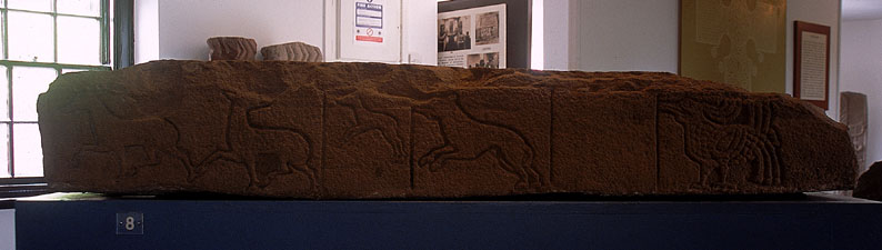 墓石の側面に動物が彫られているが、ひとこま空いているのが不思議だ。全体にシンプルながら動きのある、上手な線だが、右端の鳥は他と比べてデザイン化されており、似たような意匠は『ケルズの書』にも見られる。