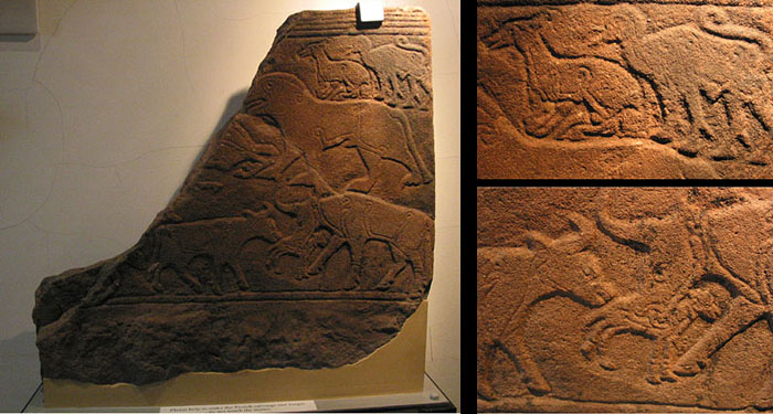 この石板も興味深い。生まれたばかりの子牛を親牛がなめている様子が描かれている。他の動物も描かれているが、全て渦巻き模様の入ったタイプの描き方だ。