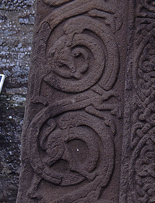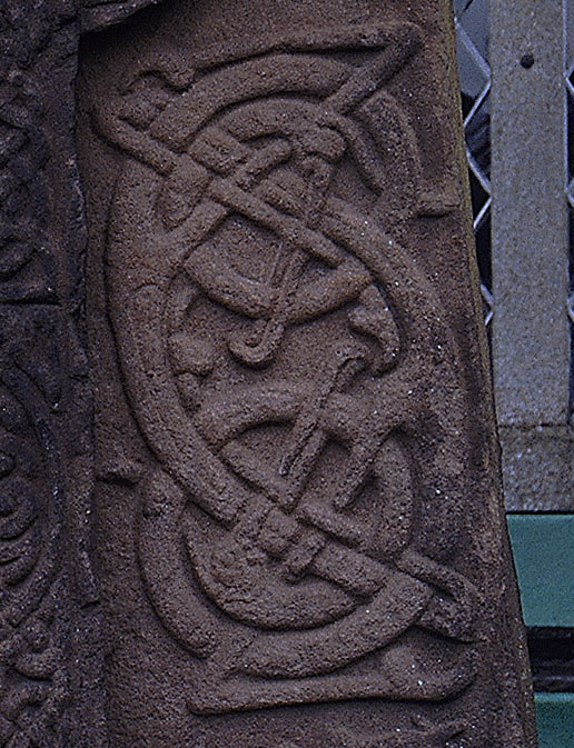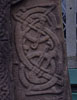 最も重要なクラス2の石碑がアバーレムノの教会の敷地内にある。十字架は精緻な渦巻き、雷紋、組み紐文様で飾られ、周囲にはアングロ・サクソン系の動物組み紐文様がバランス良く配置されている。ピクトの石碑としては非常に技術的水準の高いものだ。裏側(次頁)には歴史的戦闘の場面が描かれている。