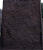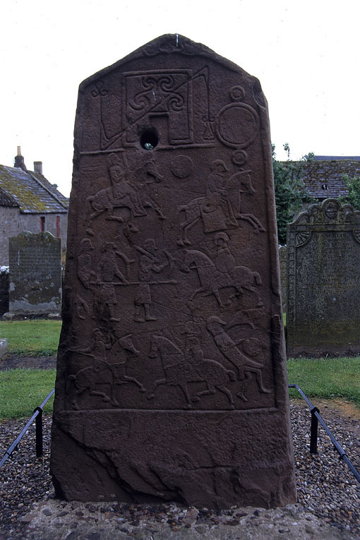 | 3頁の石碑の裏側。ここに彫られている戦闘場面は685年にピクトとノーサンブリアのアングル族の国との戦争の記録となっている。南部をノーサンバーランドの支配下におかれつつあったピクトは685年に大規模な戦闘をしかけた。Nechtansmereの戦いとして知られるこの戦争で、ピクトは完全に勝利し、ノーサンバーランドは崩壊、ピクトに対する支配だけでなく、西方のブリトン人に対する支配力も失った。この石碑はその戦いから40年ほど経ってから作られたとみられている。最上部は左にピクトの兵士、右にアングル族の兵士で、アングルの兵士は剣と盾を失って逃げるところだ。二列目はピクトの戦術を示しているようにも見える。右から槍を構えて攻めてくるアングルに対して、左にピクトの兵士が3人、一番前の兵士が盾を出し、後ろの兵士が長槍を構えている。3列目は互いに槍を構えて衝突するアングルとピクトの兵士。一番右にはアングルの兵士が盾の横に倒れており、カラスが近寄っていて、この兵士が死んでいることを表している。 |