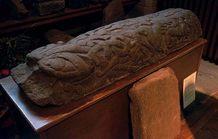 カテドラル内にあるhogback様式の墓石。顔がついているのは珍しい。11世紀ころのものと見られている。Hogbackの墓石はスカンジナビア起源と言われている。