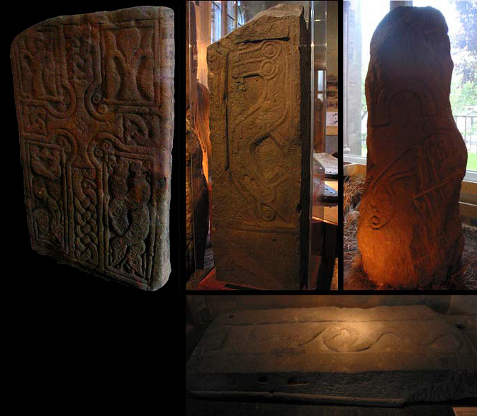 ダンディーの博物館には2003年現在6つの石碑があった。左からBenvieの十字架(ピクトのシンボルは無い)、中央は奇妙な姿の魚?鯨。右はAberlemnoのFlemington Farmで1962年に見つかったもの。上部に馬蹄、下に「ゾウ」がある。
