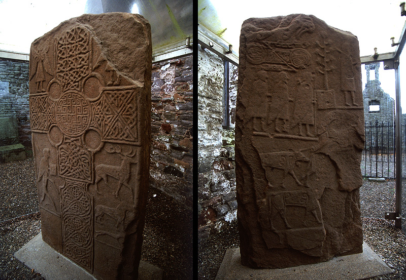 | Eassie 教会の廃墟の中にガラスケース入れられて保管されている。十字は細かな組み紐紋様の保存も良い。十字にリングが付いた「ケルト十字」タイプであり、形も紋様もAberlemnoの教会前のものと共通点が多い。十字の上部左右に天使像、下部左右には鹿や犬などの動物と狩人らしき人物が見える。裏面には上から「ゾウ」、その下にダブル・ディスクにZ棒、その下には長い外套を纏い、槍などを持った三人のピクト人像がある。その右上に鉢に植えられた木とやはり長い衣装を着たピクト人像、左したには二頭の牛、この牛は足の付け根などに渦巻き紋様が入った「ケルズの書」型で描かれている。右上には馬の鞍のシンボルも見える。最下部は損傷が酷い。 |