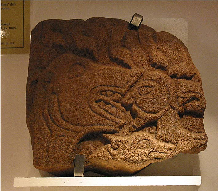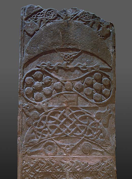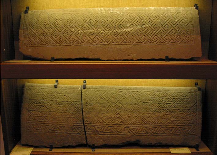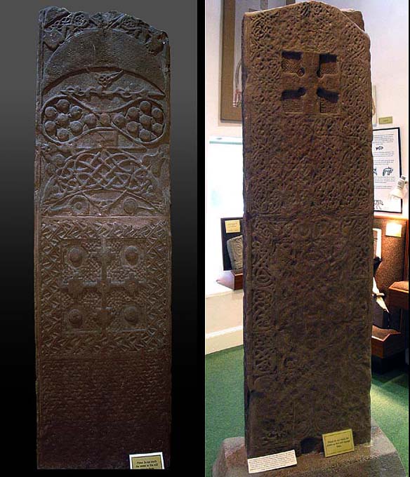 Rosiemarkieにある小さな博物館Groam House Museumにあるこの石碑は一般的なクラス2の石碑と趣の違う独特なものだ。十字架の面は組み紐で埋め尽くされているが、摩耗が激しい。十字架はアイリッシュタイプではなく、珍しく縦横の長さが同じ、小さな十字架だ。裏面のピクトのマークもユニークだ。この石碑は最上部と最下部が失われているが、三日月にV字棒が見たところ二つ、失われた最小部にもう一つあったようなので、計三つある。さらにダブル・ディスクにZ棒、その中に小さく書き込まれたクシ、一番下の三日月のした両脇に小さく鏡が二つ描かれている。同じシンボルがこれほど繰り返し出てくるのも珍しい。博物館には他にも雷紋が彫られた墓石やピクトの石碑の破片がいくつか展示されている(下写真)。二階ではピクトに関する短い映画を上映していて、これがなかなかよくできている。 |