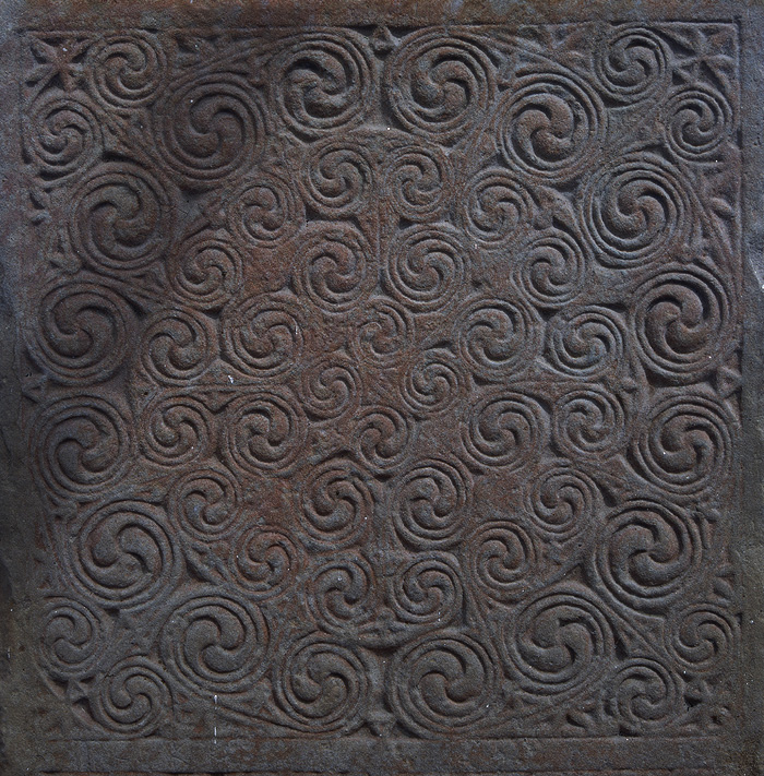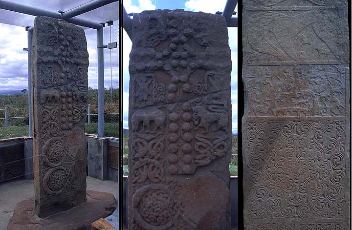 | 車道から少しはずれた、海が見える眺めのいい丘の上にガラスケースに入れられて立っている。クラス2の石碑だが、表の十字架の面はかなり粗い作りになっている。ノーサンブリア風の動物組み紐文様が見える。裏面は一転して非常に精緻なレリーフで、明らかに作り手が異なる。裏面の最上部はここには写っていないが、ダブル・ディスクにZ棒、その下に「ゾウ」がある。さらに下には狩りのシーンがあり、さらに下には渦巻き模様のパネルがある。この渦巻き模様のレリーフはいわゆる「島嶼ケルト」の遺物のなかでも最も完成度の高いものの一つではないだろうか。中心から渦が無限にわき上がってくるようなダイナミックな力を感じる。石が置かれた丘は古くから埋葬の地と言われていたようだが、石の下からは何もでてこなかったという。 |