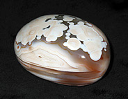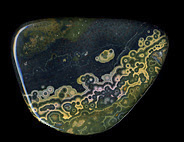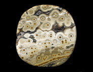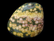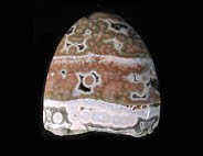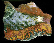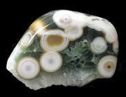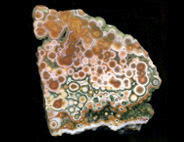 ここ10年ほどで、メノウやジャスパーなどの半貴石の世界で最も大きな発見・新種というと、2000年に発見されたマダガスカルのOcean Jasperかもしれない。産地は島の北西部の海岸線で、干潮時のみ採掘ができることからこの名が付いた。Laguna Agateの採掘などを行った鉱物ディーラーのThe Gem Shopがこの名を付けた。登録商標だ。ジャスパーと名がついてはいるが、殆どが半透明であり、実質的にはメノウといえる。球形の模様が入ったジャスパーをOrbicular Jasperと呼ぶが、この石はこれまで発見されたどんなOrbicular Jasperよりも派手で個性が強い。東京国際ミネラルフェアーに初めてこの石がずらりと並んでいるのを見たときは、ヴェネチアン・グラスかあるいは派手な彩色の陶器が並んでいるかのような印象だった。色と模様の組み合わせのバリエーションは数え切れないほど多く、とても同じエリアから採れたものとは思えない多様性がある。アメリカ市場に大変な量の原石が流入しているので、枯渇するのは時間の問題とも思えるが、少し離れた海岸から別のタイプの石も発見されているし、鉱物の宝庫であるマダガスカルで今後さらに新しい石がみつかる可能性も少なくない。この他にもマダガスカルでは非常に良質なデンドリティック・アゲートや深い赤とインクルージョンが美しいカーネリアンなど複数の種類のメノウが採れる。