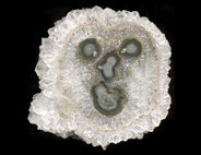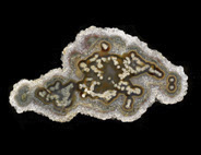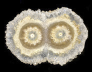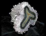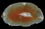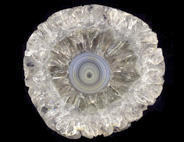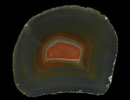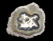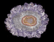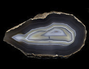 大量のメノウを産するブラジル南部と国境を接するウルグアイでもメノウは多く採れる。ほとんどがブラジル国境付近だが、無色で模様にも乏しいものが多いため、殆どが加工用に回され、標本となるものは少ない。ただ、一つのメノウにフォーティフィケーションとオニキスバンディングのパターンが組み合わさって入っているものをドイツなどでは「ウルグアイ・タイプ」と呼ぶこともあるので、かつては良質な標本が多く流通していたのかもしれない。ウルグアイ産でユニークなのは水晶やアメジストのStalactite=結晶が棒状に集合しているものの内部にメノウが入っているものだ。いろんな形でメノウが入っていて面白いが、中心にまん丸く同心円状に縞模様が入っているものはEye Agateととして珍重される。石の文様を文化的に論じたフランスの学者ロジェ・カイヨワの名著「石が書く」でもクリスタルの中に黒目の大きなeye agateが紹介されていた。以下に紹介するものは Stalactiteを薄く輪切りにしたもので、ミネラル・ショーなどで多く売られている。