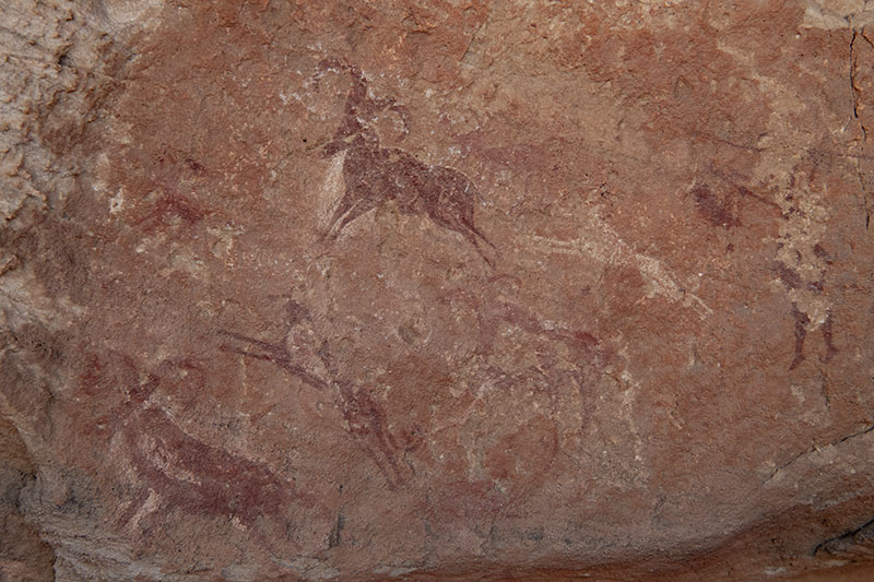 Moul Nagaの南西のシェルターに残るアウダッド羊の狩りの絵。