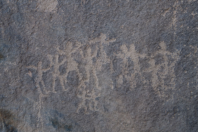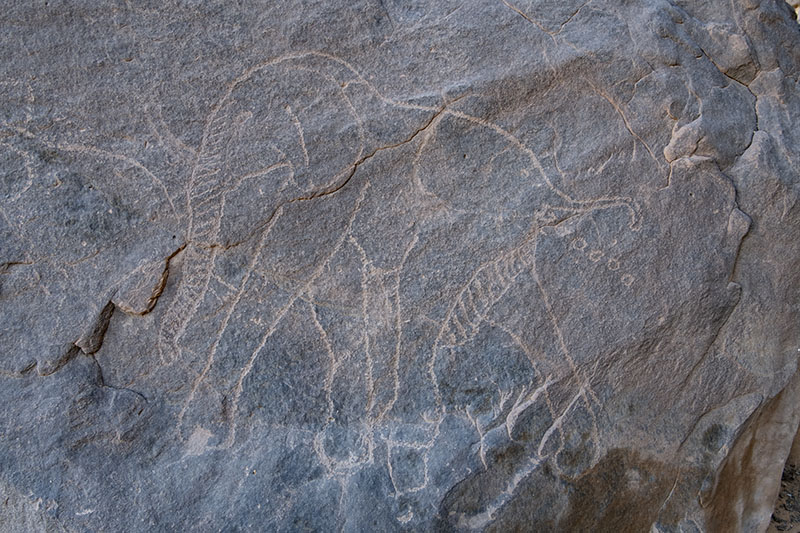 Ouan Iskaの線刻画のある大きな岩。象と人間たち。右端の象は糞をしている(下右)。
