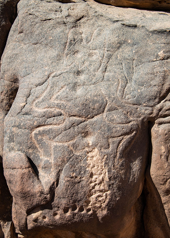 タッシリ・ナジェールへの旅の起点になる街、Djanetの町西方にある岩場にある刻画。獣人のような姿はジンの一種とも考えられている。 巨大な男根があったものを削り取ったもの。