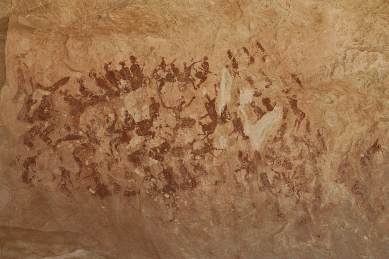 タッシリ・ナジェールへの旅の起点になる街、Djanetの町西方にある岩場に描かれた絵。全頁の絵を修正し、補正したもの。 円形に座った人たちの中に踊る人が数人描かれている。踊る人の中の二人は女性に見える。