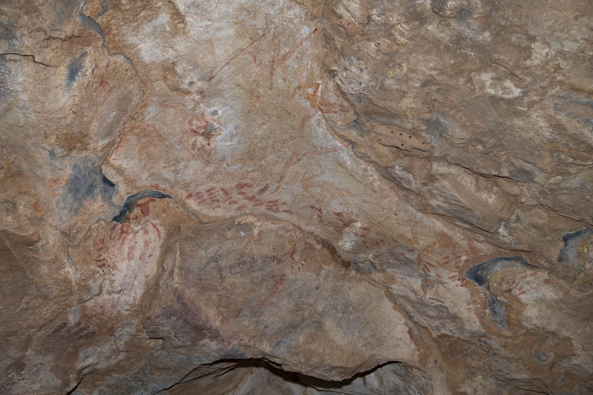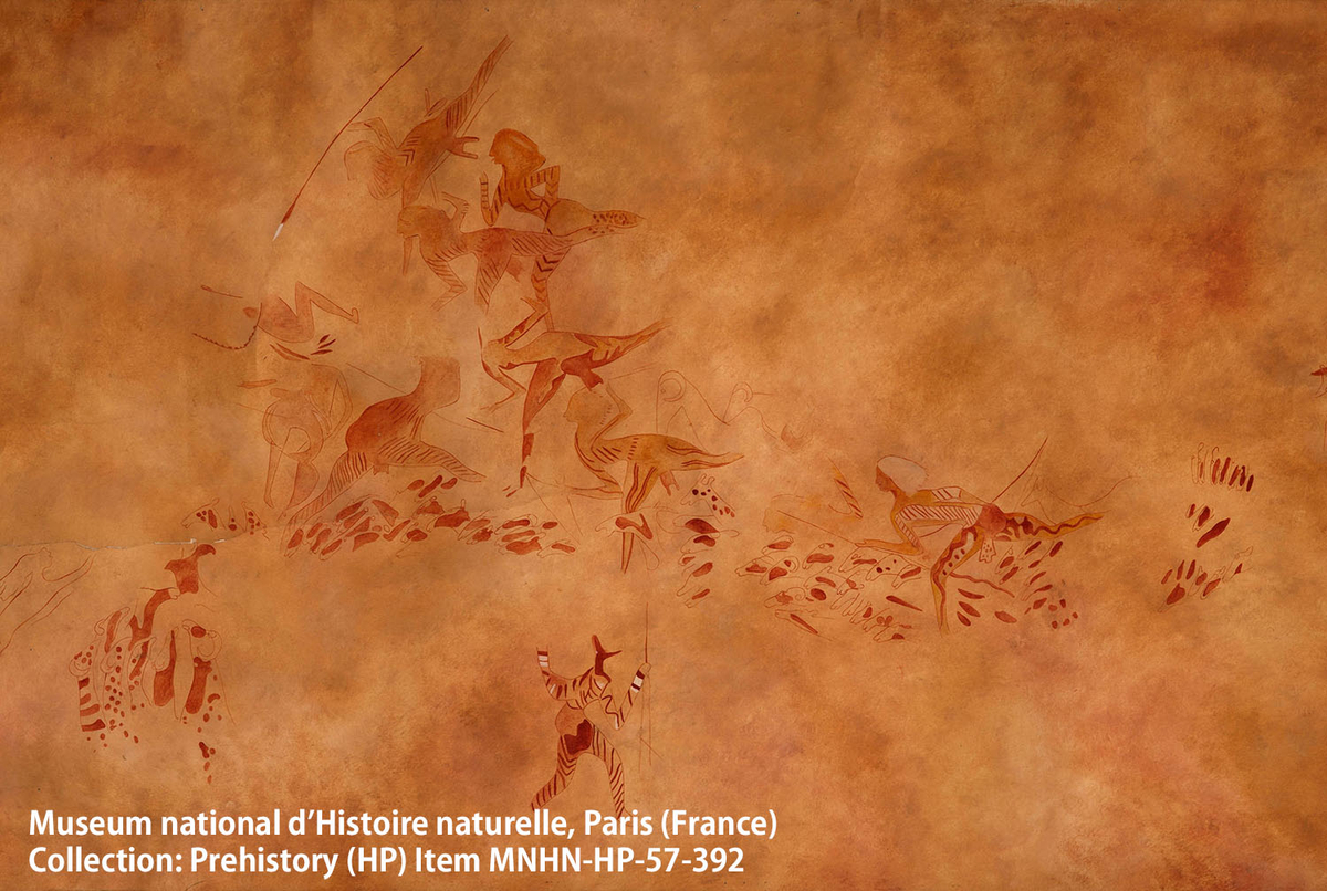 タッシリ・ナジェール、タムリットの狩猟の場面と考えられる絵。イヘーレン様式。小さな赤い点は羊の頭部で、おそらくキャンプ内に入ってきたライオンを狩っている場面。 下は画像補正をして部分拡大したものと、アンリ・ロート隊による模写。