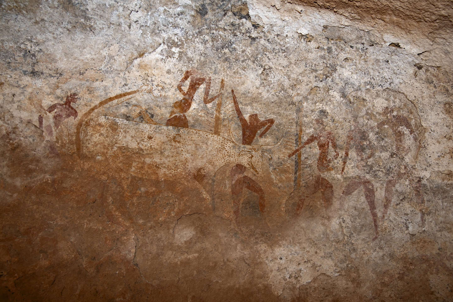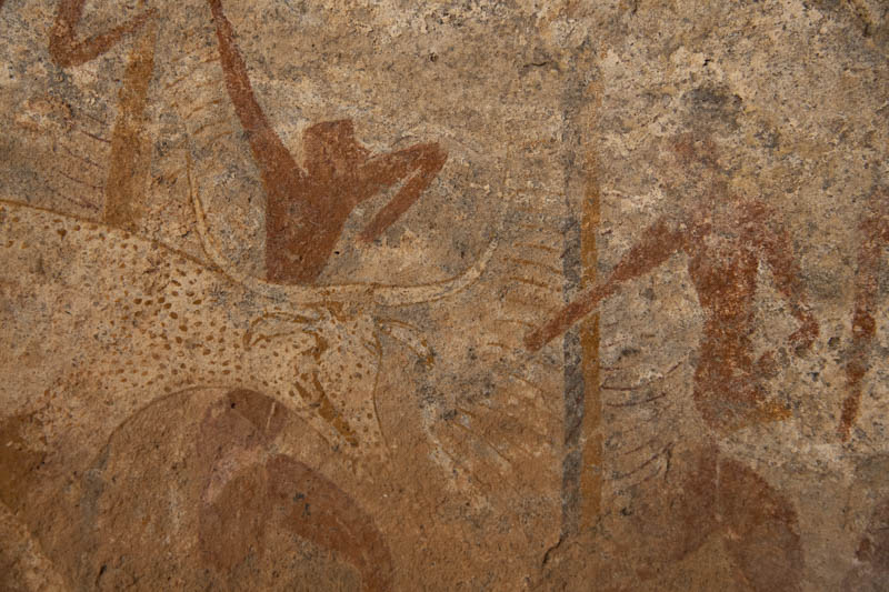 タッシリ・ナジェール、ウワン・ダーバウエンの壁画。 二色に塗り分けられた細長いものは左端に顔があり、蛇と考えられている。牛の体を蛇が取り巻いている図は他にも見られる。