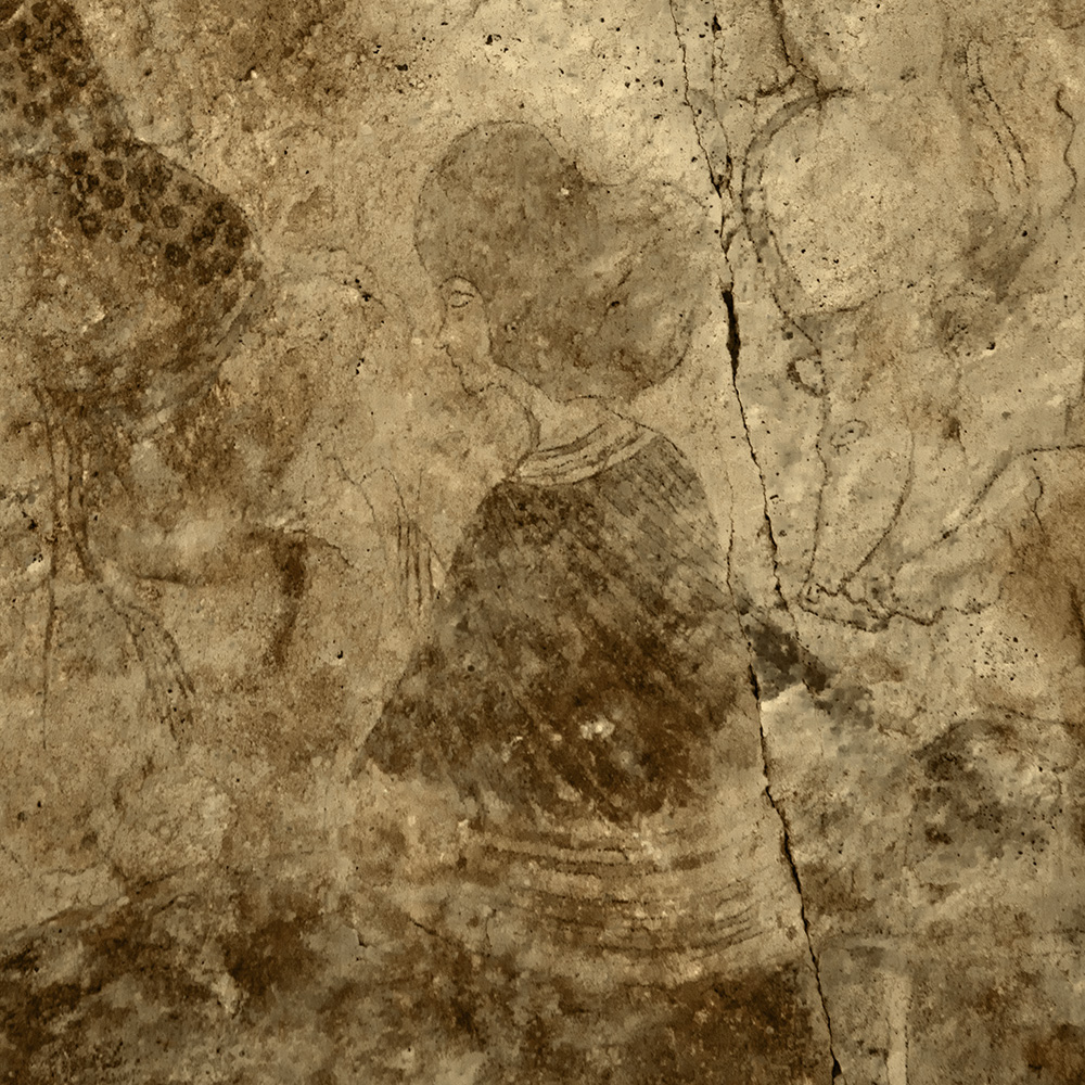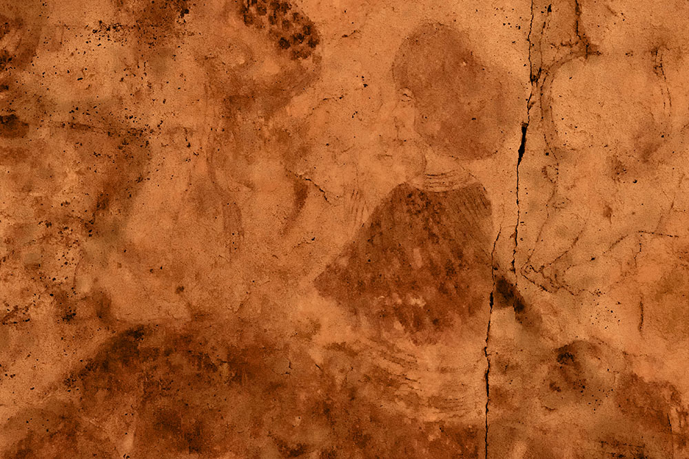 タッシリ・ナジェール、ウワン・ダーバウエンの壁画。全頁と同じパネルの部分。ほのかに青い色がついているように見える。 上2点は画像処理したもので、3点目が。