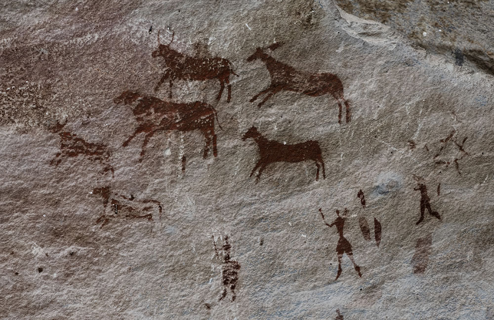 シマウマや牛らしき動物が見える、牧畜を行う文化が入ってきてからの、比較的新しい絵。下は画像処理によって鮮明にしたもの。