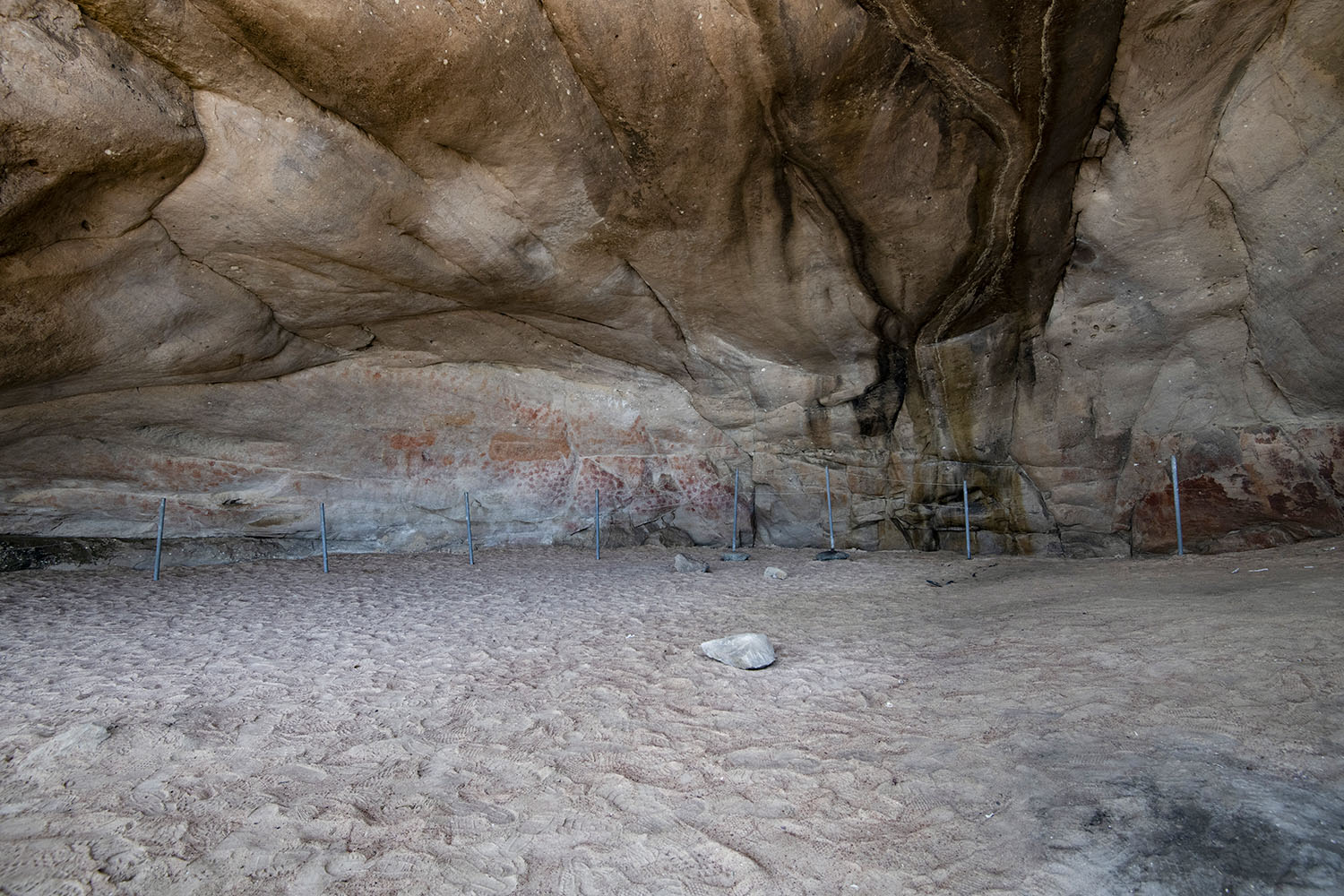 エランズ・ベイ・ケイヴ内部。天上の高い奥行きのあるシェルターの奥の壁面に壁画がある。