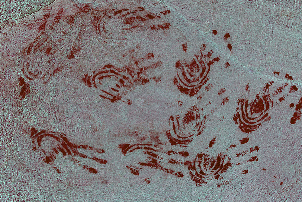 エランズ・ベイ・ケイヴの壁画。前頁の写真の中の手形。右左両方ある。