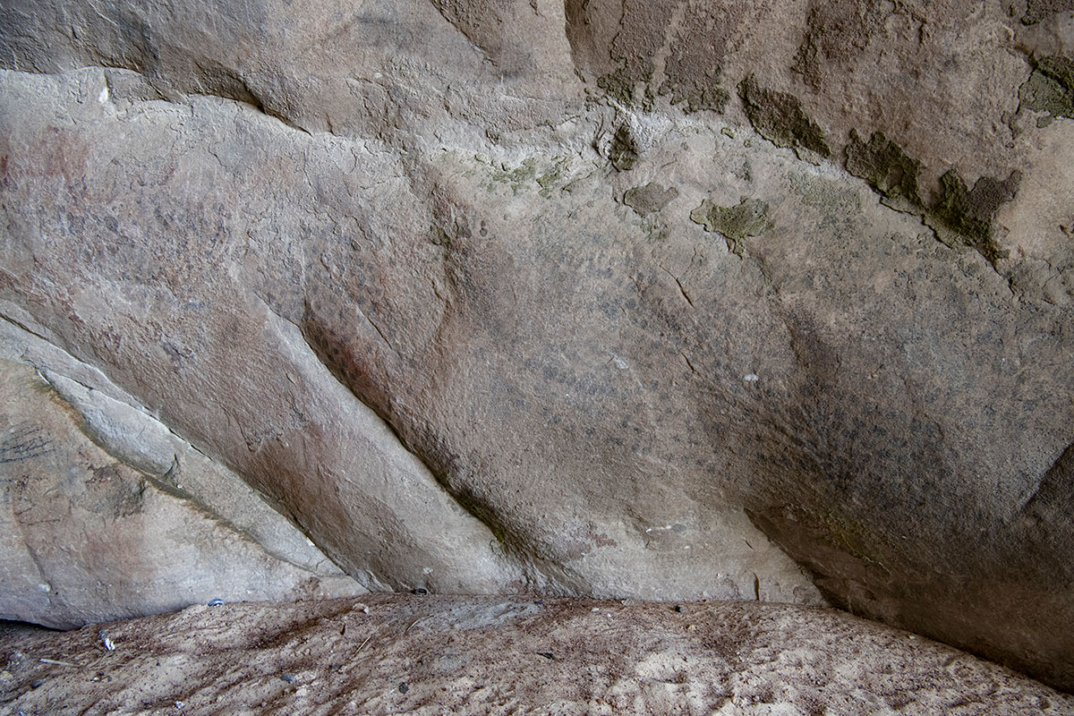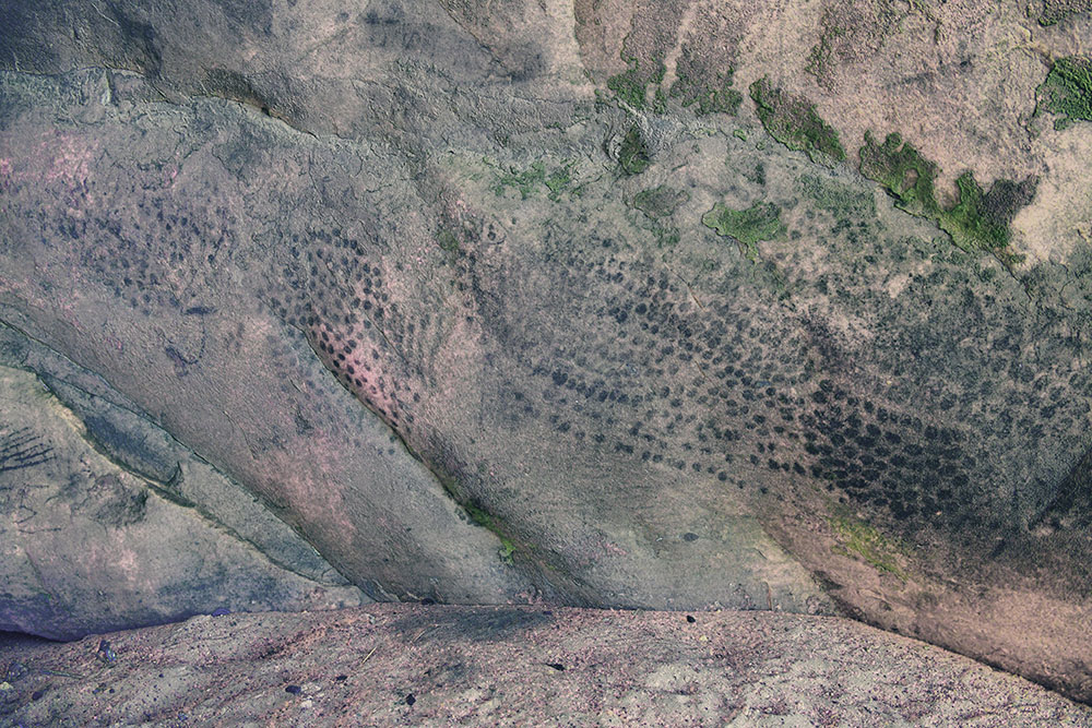 エランズ・ベイ・ケイヴの壁画。斑点がびっしりと描かれた壁面。下は画像処理で鮮明に加工したもの。