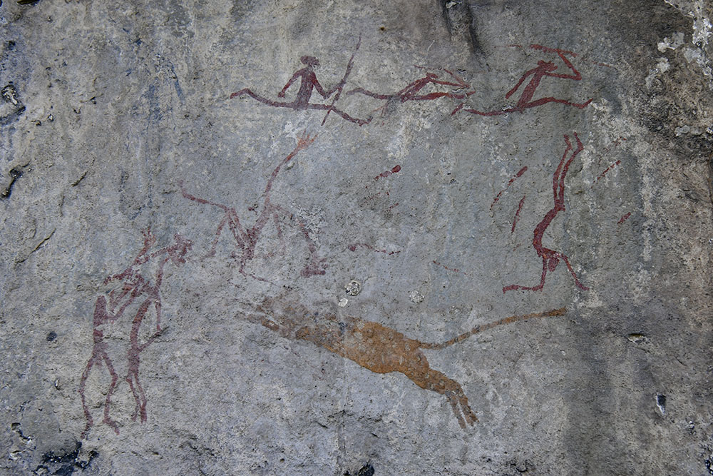 マッシュルーム・シェルターの壁画。ライオンがキャンプに入り込んだ状況を描いたもの。