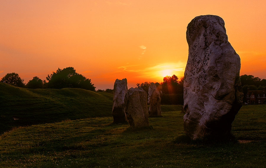 イギリス先史時代の最も大規模な施設はAvebury=エイヴベリーのストーンサークルとそこにつながる二つのアヴェニューだ。 エイヴベリーと近郊のMarlborough周辺にはSilbury HillThe Sanctuaryなどの石器時代から青銅器時代の遺構が数多く残っていて、この地域がかつて大規模な宗教センターのようなものだったことを伺わせるが、その中心に位置するのがエイヴベリーのストーンサークルで、直径425メートルの巨大なサークルはひとつの集落をすっぽりと囲い込んでいる。ほとんどが失われているが、内側にはさらに二つの小さなサークルと石の列があり、この複合的なサークルに南西、南東それぞれ2つの方向から数キロに及ぶ列石のアヴェニューがつながっている(18世紀の図を見るとかつての形がだいたいわかる)。外側の岩は合計98あったようだが、大半は中世から過去数世紀の間に倒され、埋められ、あるいは砕かれて村の建設に使われたため。今残っているのはわずか27個だけだ。内側のサークルも一部しか残っていない。大きいのはサークルの規模だけではない。岩の大きさも最大級だ。現在立っているものの中で最も大きなものは重さ60トンにもおよび、近年発掘された岩には100トン近い重さのものがあったという。岩は全て近郊のマールボロから運ばれたサーセン石と呼ばれる砂岩で、ストーンヘンジに使われているものと同じものだが、加工・形成されていない自然のままの形で、どの岩にも独特な表情がある。紀元前2500年頃から建造が始まったと見られる。サークルの周囲には深い堀が掘られ堀の内側はマウンド状に土が盛り上げられている。現在は集落ごと世界遺産として保存されており、サークル内には発掘品を展示する博物館もある。