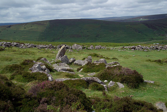 Hut Circleの一つ。この遺跡はダートムア公園の比較的東側に位置している。西側に傾いた斜面に作られているので、遺跡から西側を見ると遥か彼方まで荒野が広がっている。
