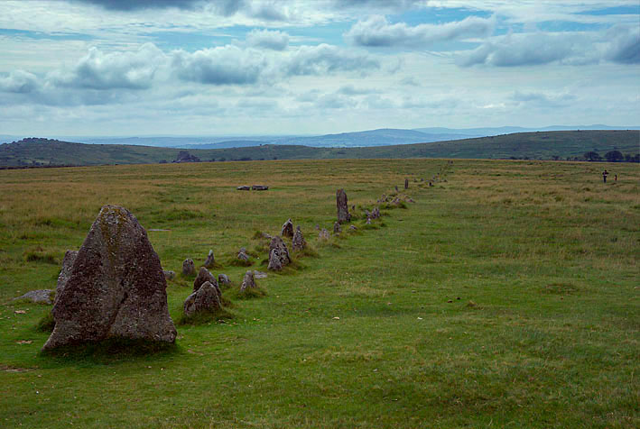 ダートムア西方のTavistockに近い丘の上に列石、サークル、立石、石塚などの複合施設跡がある。列石は二列あるが、写真は南側のもので約260mほどの長さ。石は数十センチほどの小さなもので幅も人一人が通れる程度の狭いものだ。すぐ近くに花崗岩の鉱山があるが、現在は採掘は行われていない、この遺跡の岩はすべてその花崗岩で作られている。17世紀前半にペストが大流行した際、近くのTavistockの住民と近隣の農家は人と接触して感染することを恐れ、この場所を無人の農作物と代金の交換場所として使ったという。そのため、「ペスト市場」、あるいは「芋の市場」と呼ばれている。 |