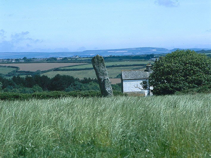 Merry Maidensのサークルの北西、道路を挟んで数百メートルの牧草地の中に立つ、背の高いスタンディング・ストーン。