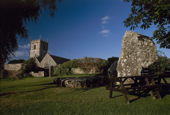 スタントン・ドゥルーの巨石複合施設の南西の端にあるCove=コーウ゛と呼ばれる、三つの石板をコの字型に組んだ施設。中央の板が倒れている。左奥はセント・メアリー教会。ストーンサークル群とはこの教会で隔てられているが、意図的に、「異教の施設」を分断する形で建てられたものかもしれない。コーウ゛は、現在、「ドゥルイド・アームズ」という名のパブの裏庭のビア・ガーデンにある。 |