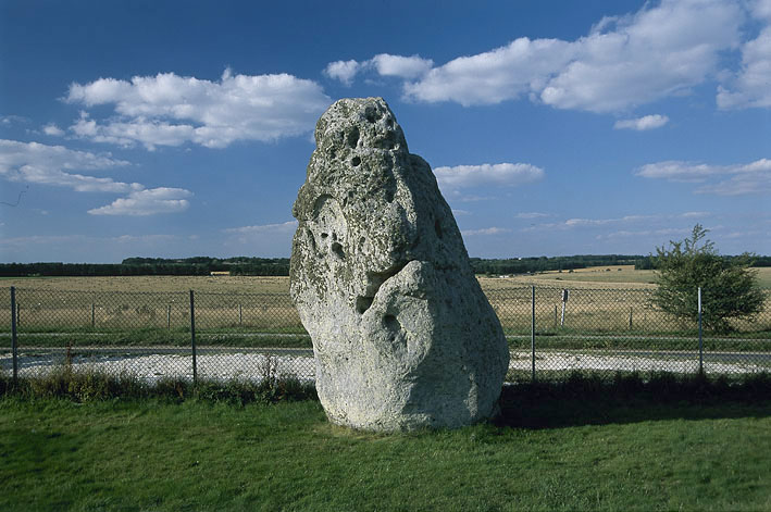 サークルの北東にあるヒール・ストーン。ストーンヘンジは悪魔が魔法使いマーリンに命じられて、アイルランドから一夜で運んで来たという伝説がある。一夜にして巨大な石組みが出現したら、皆さぞ驚くだろうと悦に入る悪魔の様子を一人の修道士が見ていた。逃げる修道士に悪魔が岩を投げつけ、かかとを砕いたという言い伝えから、この名になっている。ヘンジ内の岩がすべて形成、加工されたものであるのに対し、この岩は手を加えられていない。 |