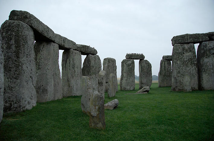 外側に並ぶサーセン石と内側に並ぶ背の低いブルーストーンの配置がよくわかる。ブルーストーンは初めは二重の半円、馬蹄状に並べられ、その後数度配置換えが行われている。最終的にブルーストーンは外側のサーセン石のサークルの内側に約60個のサークル、内側の三石塔のさらに内側に馬蹄形に19〜20個並んでいたと見られているが、現在はほとんど原型をとどめていない。サーセン石に比べて柔らかいため、近代に入って観光名所になってからも記念に削る、割って持ち帰るなど、破壊が続いたという。 |