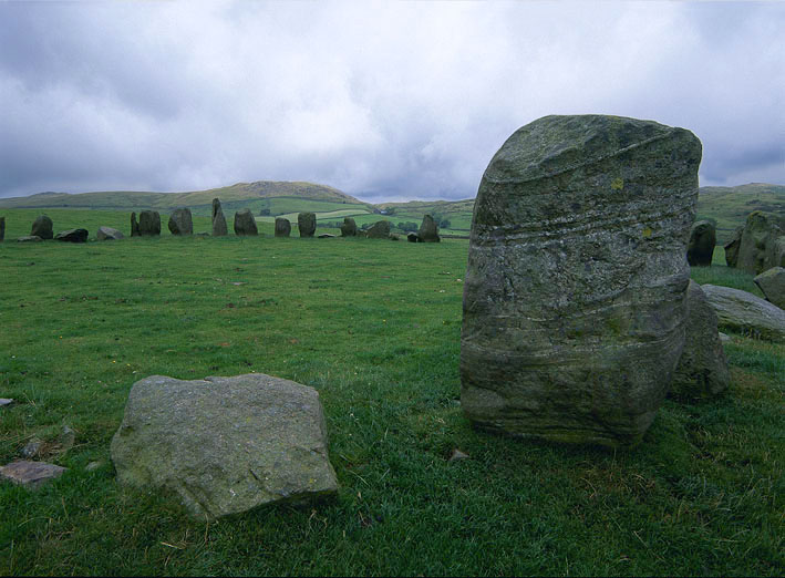 直径30メートル弱のほぼまん丸のサークルで、元は60個あったとみられる石の55個が残っており、そのうち32個が立っている。とても保存状態の良いサークルだ。南東側に入り口があり、その両側だけ岩が二重に置かれている。これは湖水地方特有のスタイルだ。これが発展してイングランド南西部のエイヴベリーなどのアヴェニュー付きのサークルの形になったのではないかという説がある。 |