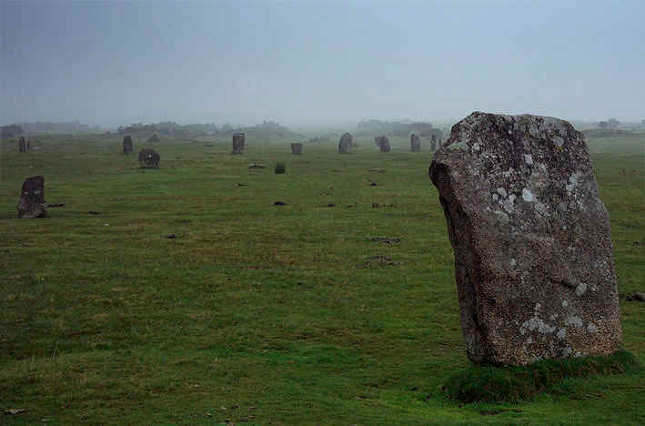 コーンウォールの東端、Bodomin Moor=ボドミン・ムアの東側の町Minion=ミニヨン近くにある。三つの大きなサークルが南北に隣接する独特な形をしている。花崗岩は珍しく四角く加工されている。すぐ近くに花崗岩の露頭があり、大きさは南と北のサークルが直径30メートル代半ば、中央のサークルが40メートル強と最も大きい。ハーリングはケルト起源のゲームで、19世紀頃までコーンウォールで盛んに行なわれていた。ブタなどの皮に苔や草を詰め込んだものを銀で巻いた小さなボールを二手に分かれた男たちが奪い合い、自陣のゴールに持ち込んだ方が勝ちという単純な競技だが、大勢の男たちがぶつかり合い、もみ合う、非常に荒っぽいゲームだ。4-50人くらいから多い場合は100人を超える大人数で行なわれ、町同士で数キロの距離を日をまたいで争う大規模なものまで行なわれていたようだ。茂みや茨の中、あるいは泥沼や川の中、あるいは民家の裏庭や畑の中など、ゴールとゴールの間の全ての空間が競技場となる。競技というより、祝祭の熱狂に近いものだったともいえるだろう。ハーリングはしばしば日曜に行われていたので、ピューリタニズムが支配した時代には、厳しく指弾されていたのかもしれない。 |
