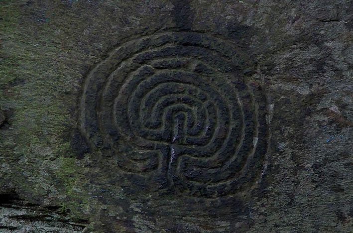 コーンウォール北方、アーサー王生誕伝説の残るTintagelの少し北、Rocky Valleyの水車小屋の廃墟近くの岸壁に残る迷路のレリーフ。作成年代については諸説あるが、青銅器時代のものだと考える向きもある。