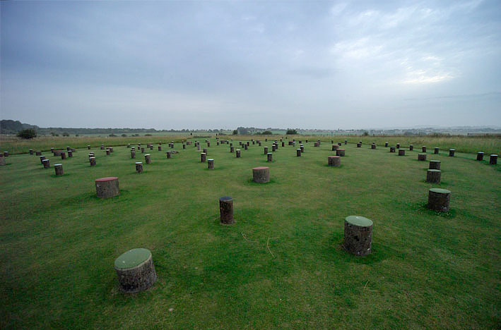 ストーンヘンジの北東約3キロの地点にある。木柱をたくさん立てた跡。ストーンヘンジ建造と同時代のものと見られている。建物の柱の跡というより、木柱を円形に林立させた宗教施設とみられている。似たものがあった痕跡がAvebury、Stanton Drewにもある。中心近くからは頭蓋骨を割られた3歳児の生贄の墓がみつかったという。柱の穴の跡にコンクリートのポストが立てられている。 |