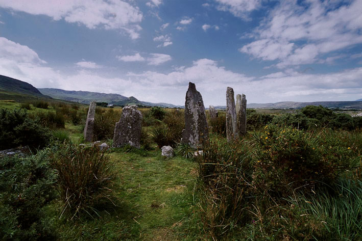 ケリー州はアイルランド有数の景勝地で、湖と原生林の美しいキラーニー国立公園、ベアラ半島の北のアイベラ半島を周遊する道リング・オブ・ケリーは観光客でいっぱいだ。対して、ベアラ半島は静かで、ハイシーズンでも行き交う車はさほど多くない。では景観が魅力に乏しいかというと、決してそんなことはない。岩肌の露わになった山間部の荒涼とした景色も良いが、周囲には磨かれた鏡のように山々を映す湖が点在し、滝の流れ落ちる緑豊かな渓谷もある。 |