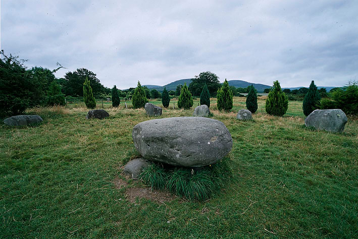 アイルランドの南西部では最大のサークルで、17.4 X 15.8メートルの卵形をしている。岩は15個、うち北側の2つは横置きになっている。中央にはキャップ・ストーンが重さ7トンほどもある墓がある。近くには銅の産地があり、その周辺に遺跡が点在している。 |