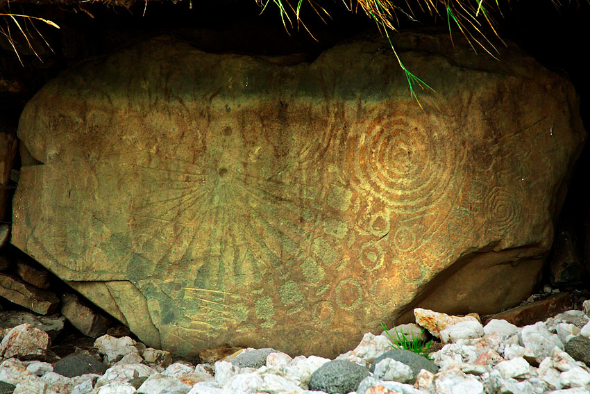 これを見るとまず日時計を連想する。放射状に延びる腕の先に円形が描かれていることから月齢と関連づけてみる人が多い。 |