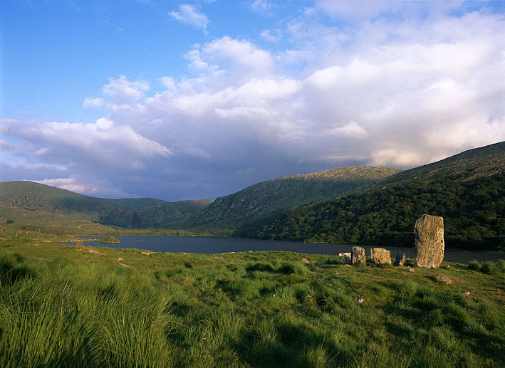 コーク州とケリー州にまたがるベアラ半島には、巨石遺構が多数残っている。ウラは非常に小さなストーンサークルだ。コーク州境に近いケリー州内の三つの湖が連なる渓谷に立っている。清流が流れ、睡蓮の花が咲く水辺から遺跡のある小高い丘の上に出ると、湖を見下ろす息をのむような景色が広がっている。 対岸には岩肌を抉りとったような断崖を滝が流れ落ちているのが見える。アイルランド南部のサークルは2つのタイプに大別できる。岩の数が10以上ある中規模のサークルと、5つの小ぶりな岩からなる非常に小さなサークルだ。このウラのサークルは、5つ岩に一つの立石が添えられた形だ。 |