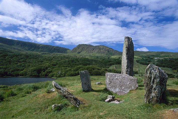 ベアラ半島には15以上ものストーンサークルがある。アイルランド有数の遺跡集中地だ。巨石群は、規模や保存状態はさしたるものでもないが、それぞれが、半島の景観の中で映える。素朴だが力強い太古の人の手によるものと、数千年間容易に手なづけられることのなかったスケールの大きな自然環境が合わさって、不思議な魅力をもった印象深い景観が生まれる。 |