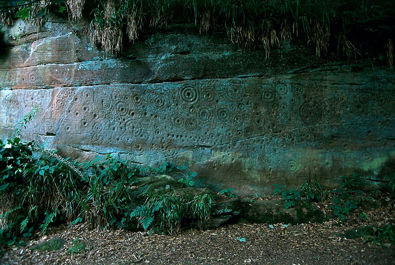 見事なCup and Ring Markが掘られた岩壁。川沿いの林のなかにあるが、発見されたのは1986年と、比較的最近だ。垂直な壁面に掘られており、林の中にあり木々に覆われているためか、露天の岩床に彫られたものにくらべ、保存状態が良い。
