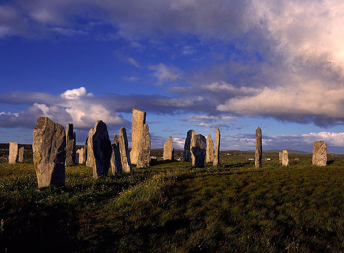 岩はすべて加工されていない、自然のままのものだが、かつては半分くらい泥炭層に沈んでいた。ルイス島は木のほとんど生えない、湿地と湖と岩山の荒涼とした土地だ。泥炭層が深く、長年、燃料として使われて来た。アイルランドから渡って来た人が多く住んでいたため、ガーリックと呼ばれる、アイルランドのゲーリックと同じ言葉を話す人が多く住んでいる。敬虔な人が多く、日曜日は島中がしんと静まりかえっていて、フェリーも出ない。 |