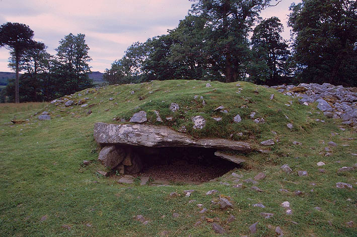 Kilmartin渓谷に残る直径30メートルの Cairn 。三つの墓穴がある。