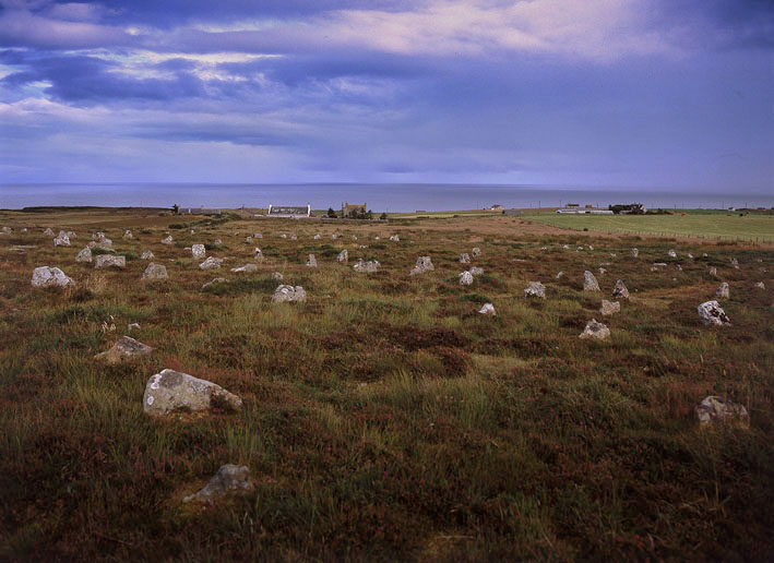 その名も「石だらけの丘」ハイランドの東部、ケイスネスの南海岸にほど近い丘の上に、約250ほどの小ぶりな岩がほぼ南北に22列のライン上に整然と並んでいる。かつては600ほどの岩があったとみられている。フランスのカルナックの列石のミニチュア版のような遺跡だ。岩はどれも一抱えほどの大きさなので、巨石とも言い難いが、時代的には巨石文化の産物。数多くの巨石遺構の調査を行い、大陸の巨石文化とブリテン島、アイルランドの巨石の多くに、共通の長さの単位、「巨石ヤード」ともいうべきものがあると主張したアレクザンダー・トムは、カルナックやこの遺跡を、太陽や月の運行を詳細に観測するための観測所と考えた。石を並べたラインを軸に、それぞれの石を目盛り代わりにし、詳細な位置の確認をしたのではないかという仮説だ。しかし、彼がカルナックで「天体観測の基準点」と考えていた大きな岩は、本来複数の岩を組み合わせた構造物の一部だったことがわかり、重要な論拠を失ってしまった。この遺跡に関しても、近くに似たようなものが20ほどあったことがわかってきたため、天体観測所と考えるには合理性でない。 |