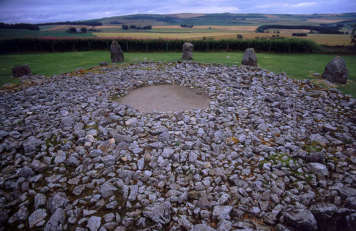 直径20.5m、8つの岩からなるRecumbentタイプのストーンサークル。サークル内のCairnは後に付け加えられたものらしいが、1932年の発掘ではCairnの下から火葬に使われたと見られる柳の木の炭、中心部からは40歳くらいの男性の遺骨、2歳から5歳くらいの子供の頭蓋骨の破片が50も見つかっている。サークルのすぐ東側にはほとんど崩れているが墓の跡も残っている。 |