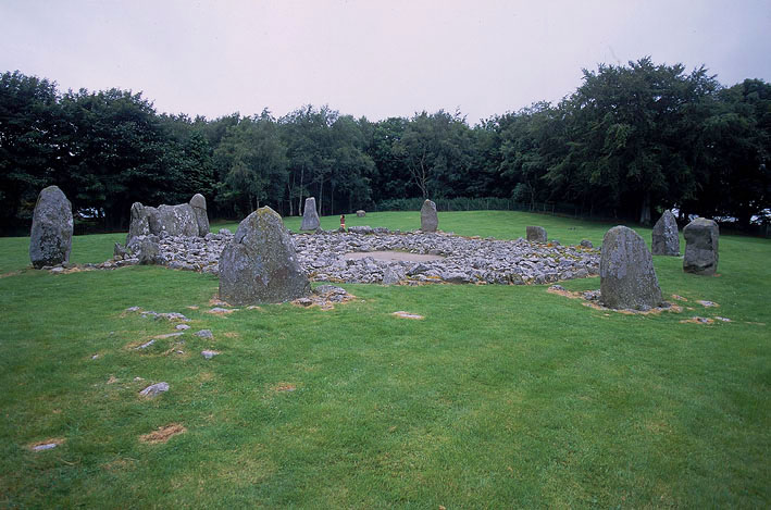 | Recumbentは2つに割れている。Recumbentの右の側石には内側に12のCupマークが彫られている。新石器時代後期の、紀元前3000年前後のストーンサークルとみられている。横石は二つに裂けてしまっているが、両側に背の高い側石が配置され、サークル内部には中央部分を空けたケルンがあり、サークルの岩は南側に向かって背が高くなっていくようにアレンジされている。 横石のあるサークルの南側は現在木立に遮られ、地平線は見えない。もしこれらの木々がなければ、横石の位置はだいたい月が最も南に沈む方角、あるいは冬至の日の日没の方角に合うとみられている。横石の東側の側石の、さらに東隣の岩の内側には12個のカップマーク(160頁)が彫られており、こちらは冬至の日の出方角と合っている。このサークルの隣には円形の、中期青銅器時代の埋葬の跡が残っていて、この場所が少なくとも1000年以上、重要な祭祀の場所であったことを示している。 |