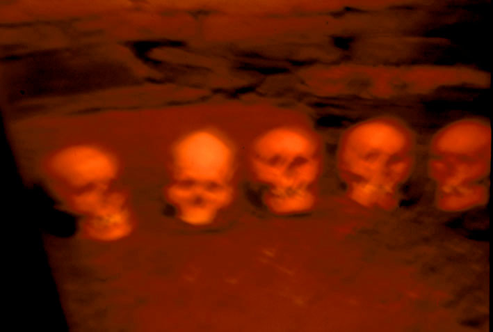 滑車のついた板にあおむけになった状態で古墳内部にも入れるようになっていて、中で電気をつけると石室に置かれた頭蓋骨がライトアップされる趣向になっている。
