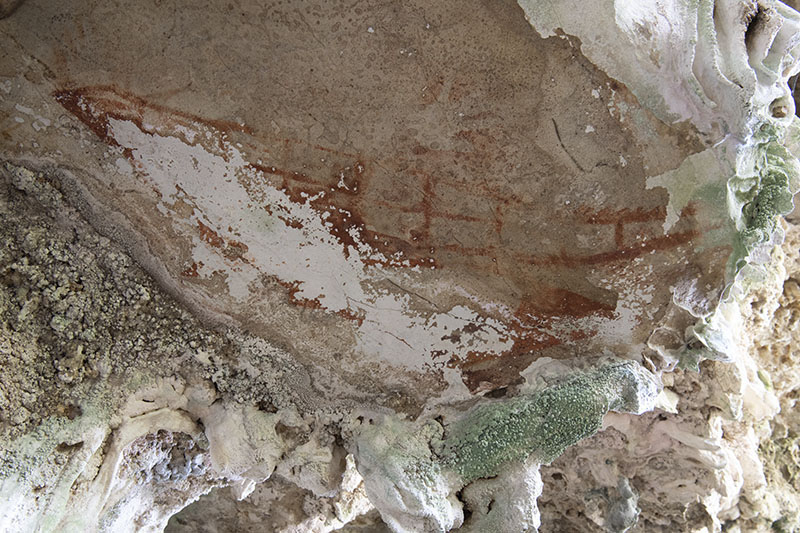 スラウェシ島、South Sulawesi地方、Bonto Lempangan村のBulu Sipong 2 洞窟。舟の絵。