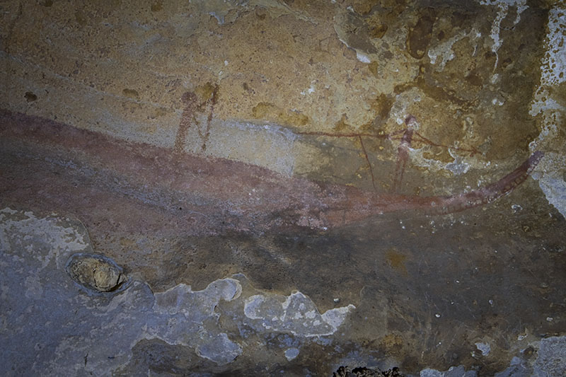 スラウェシ島、South Sulawesi地方、Bonto Lempangan村のBulu Sipong 1 洞窟。右側の舟のディテール。舟の漕ぎ手と魚を突く銛を構える人物。